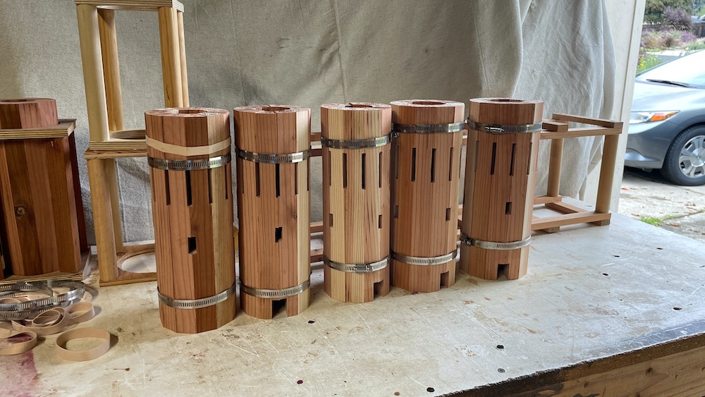 on display here were made with redwood heartwood with streaks of much lighter sapwood.