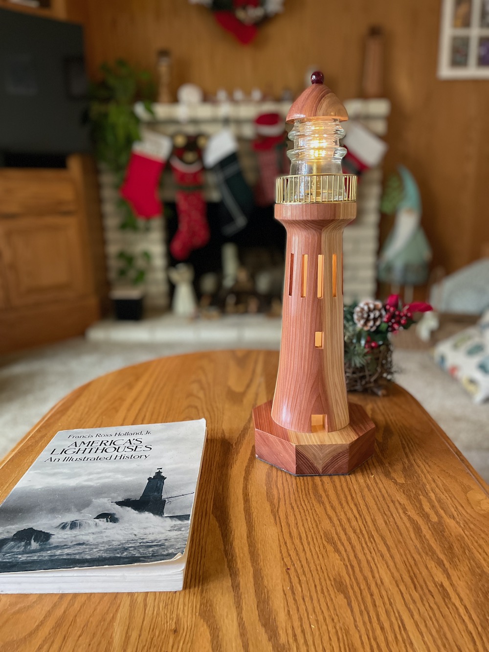 Candle Lighthouse, with internal LEDs and candle holder 'lantern room' at the top.