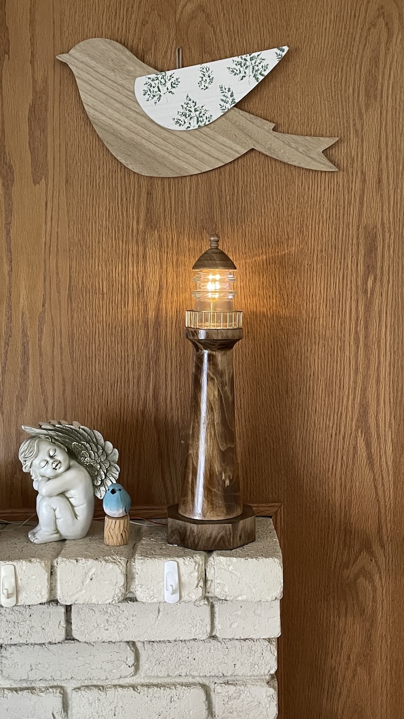 The piece on the right is made from the same tulip poplar tree that was used to make the Candle Pedestals below. At the top of this "lighthouse", the